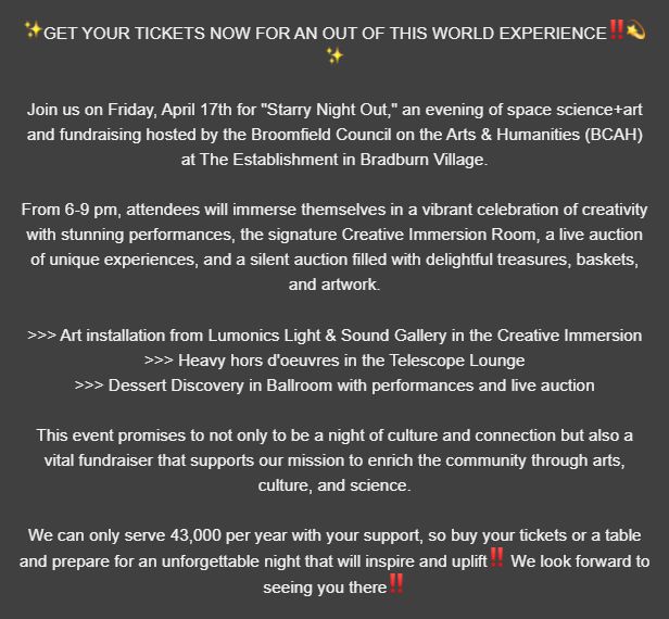 Lumonics is happy to be participating in the City of Broomfield’s Starry Night Out fundraising event.