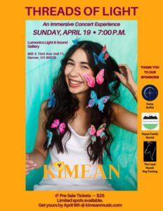 Developed in partnership with Lumonics Light & Sound Gallery, Threads of Light weaves KIMEAN’s music with the gallery’s hand-crafted light art, transforming the space into a living, breathing tapestry of sound and color.